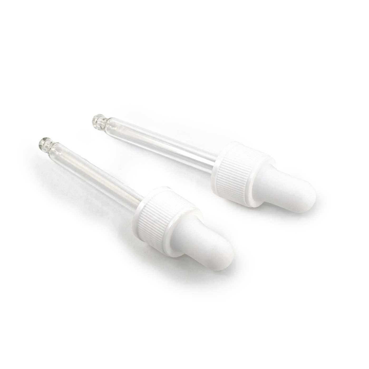 Biele plastové kvapátko, vhodné do fľašky s priemerom hrdla 18 mm a objemom 15 ml.Dĺžka sklenenej tuby: 56 mm