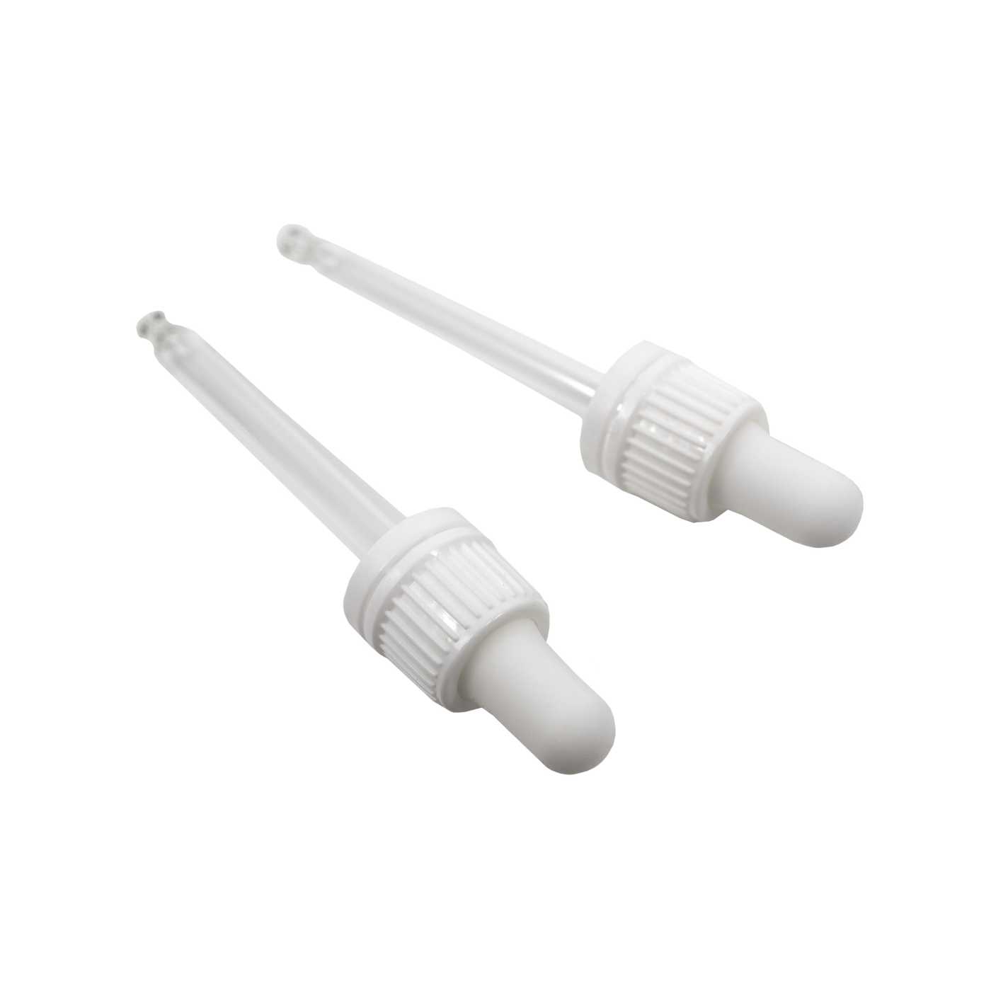 Biele plastové kvapátko, vhodné do fľašky s priemerom hrdla 18 mm a objemom 30 ml.Dĺžka sklenenej tuby: 71 mm