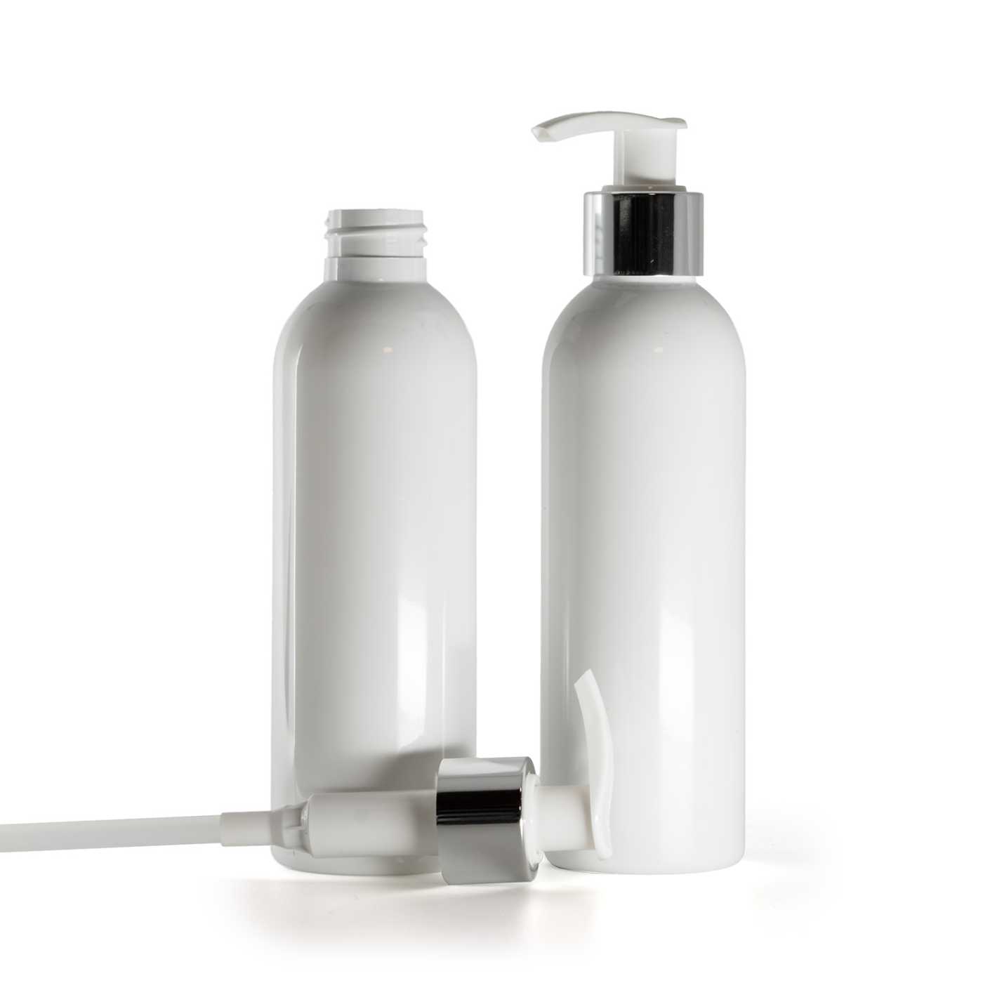 Plastová fľaša biela, bielo-strieborný dávkovač, 200 ml