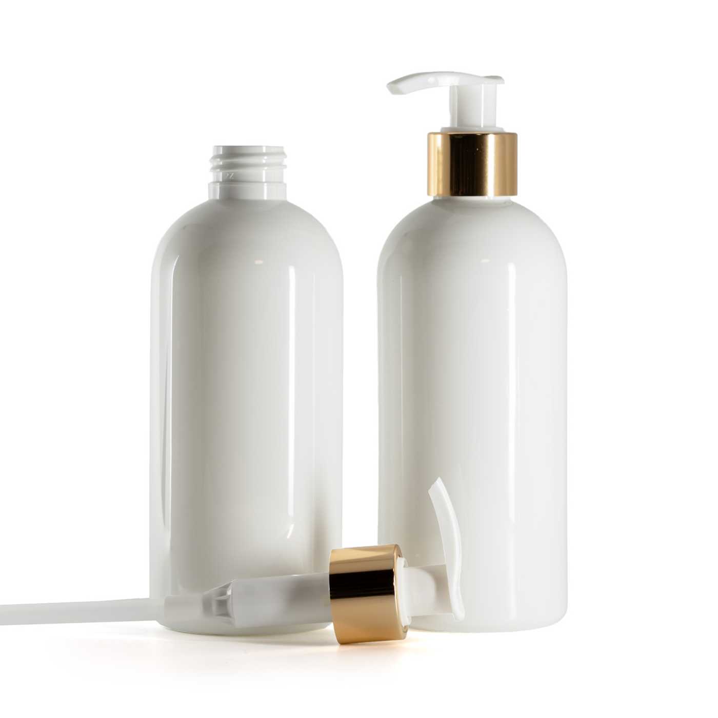 Plastový dávkovač v kominácii lesklej zlatej a bielej farby.
