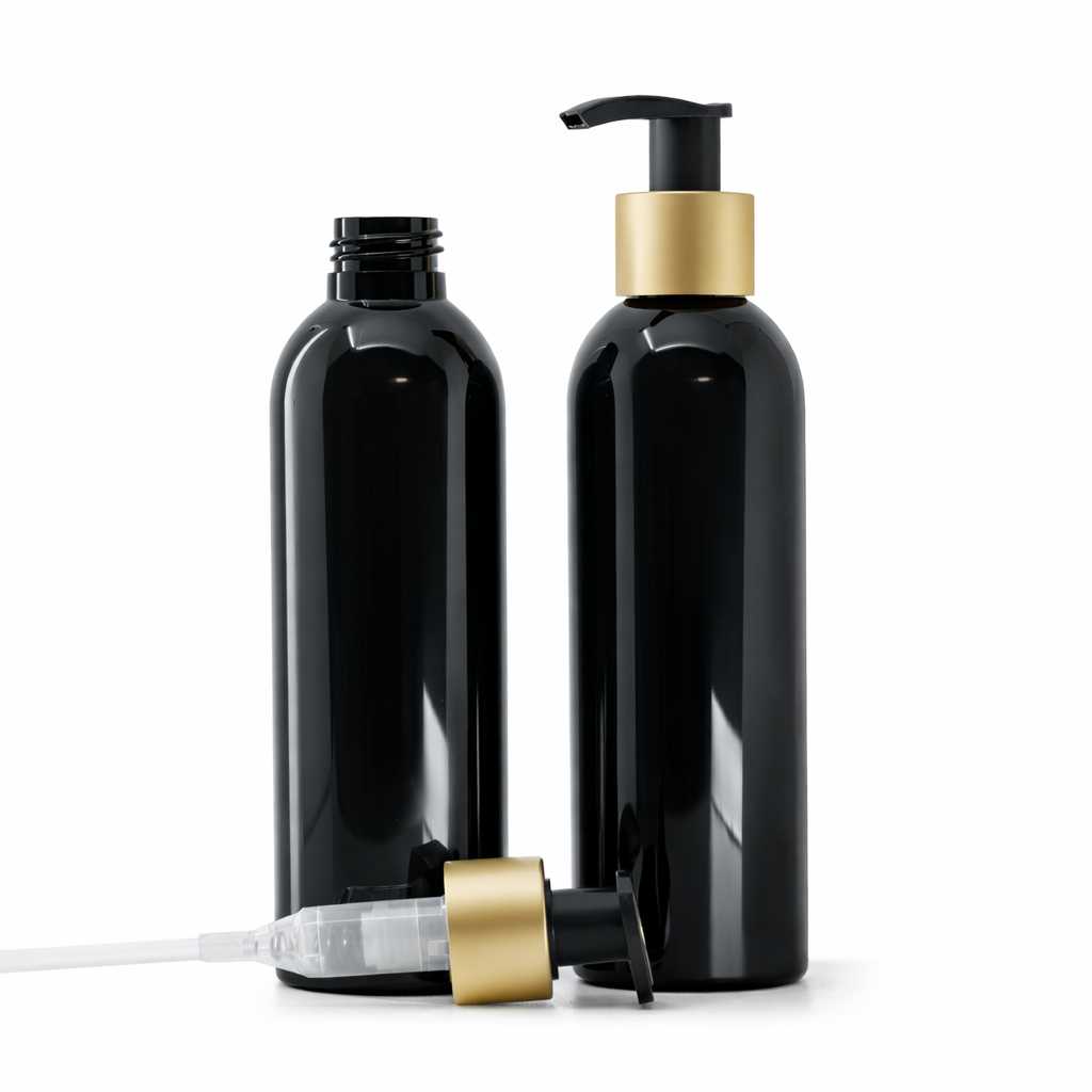 Plastová fľaša s čiernym lesklým povrchom a matným čierno-zlatým dávkovačom je elegantný a praktický obal určený najmä pre kvalitnú kozmetiku a tekuté prípravky, kde je dôležitá presná a pohodlná aplikácia. Vďaka kombinácii odolného plastového materiálu a spoľahlivého dávkovacieho systému poskytuje bezpečné balenie pre rôzne tekuté formulácie, ktoré vyžadujú hygienické, kontrolované a esteticky pôsobivé dávkovanie.