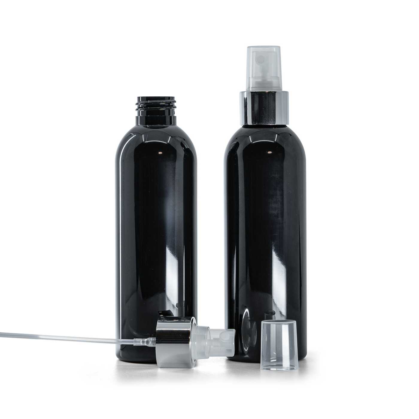 Plastová fľaša, čierna lesklá, priehľadný rozprašovač, strieborná lesklá obruč, 200 ml