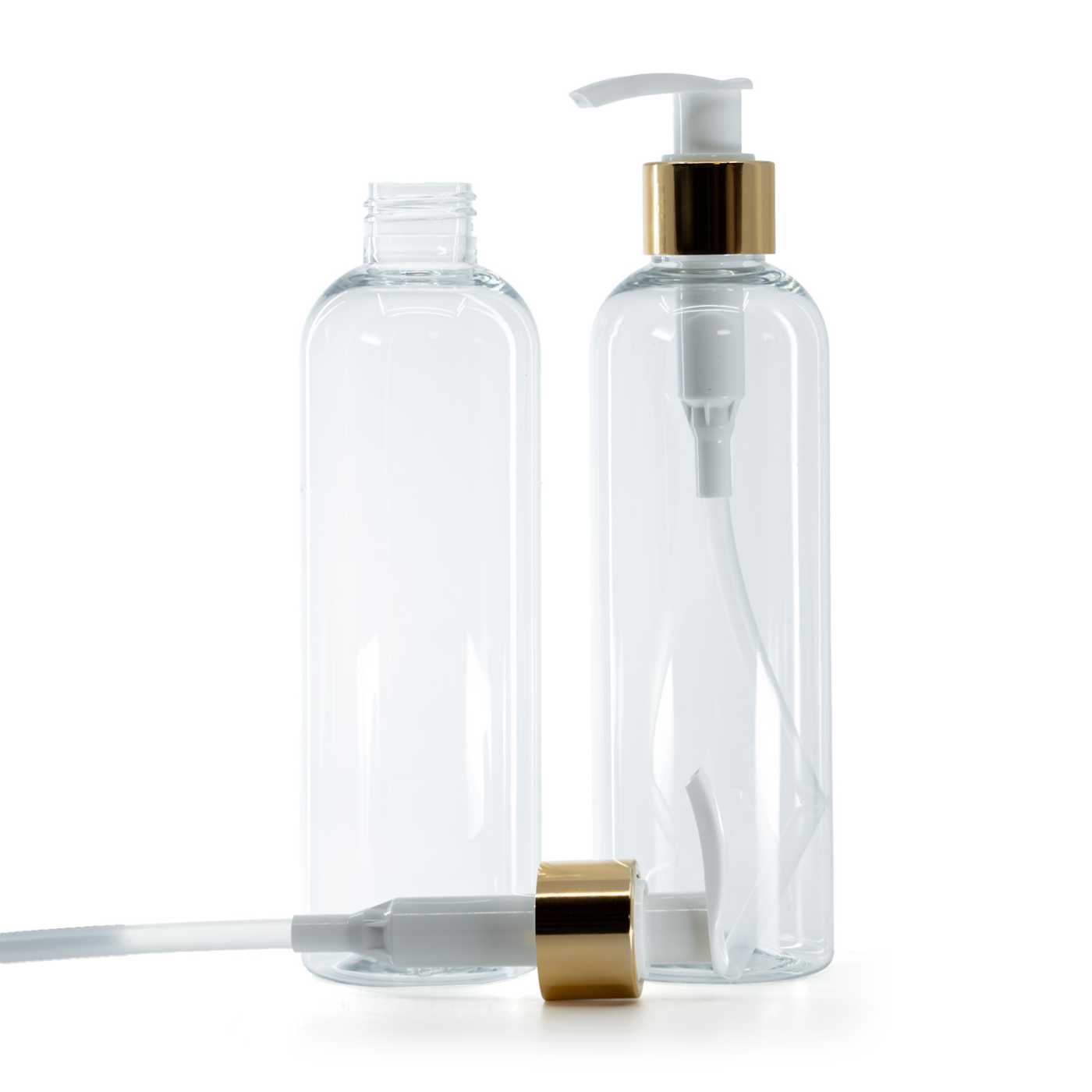 Plastová fľaša priehľadná, bielo-zlatý dávkovač, 250 ml