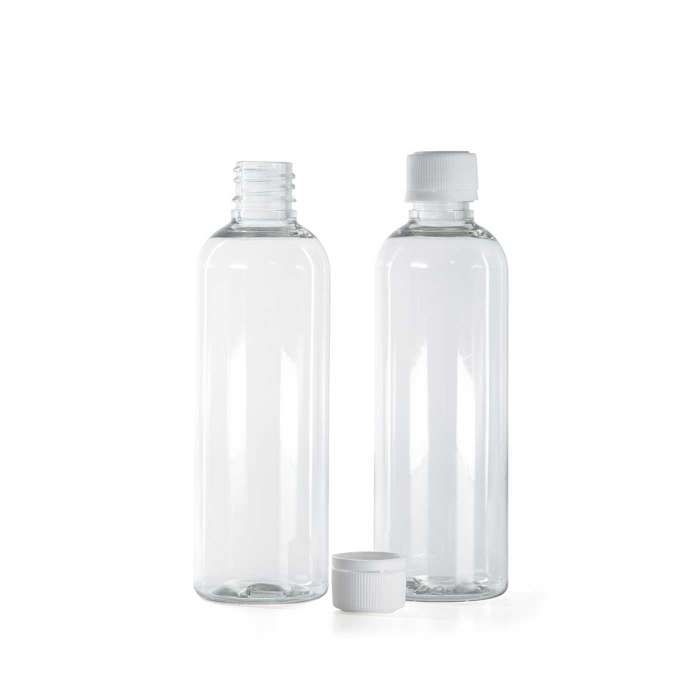 Priehľadná plastová fľaška vyrobená z PET s lesklým povrchom.