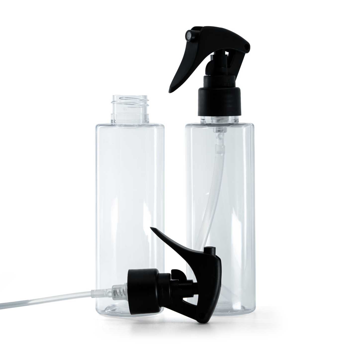Plastová fľaša priehľadná, matný čierny pákový rozprašovač, hladká obruč, 150 ml