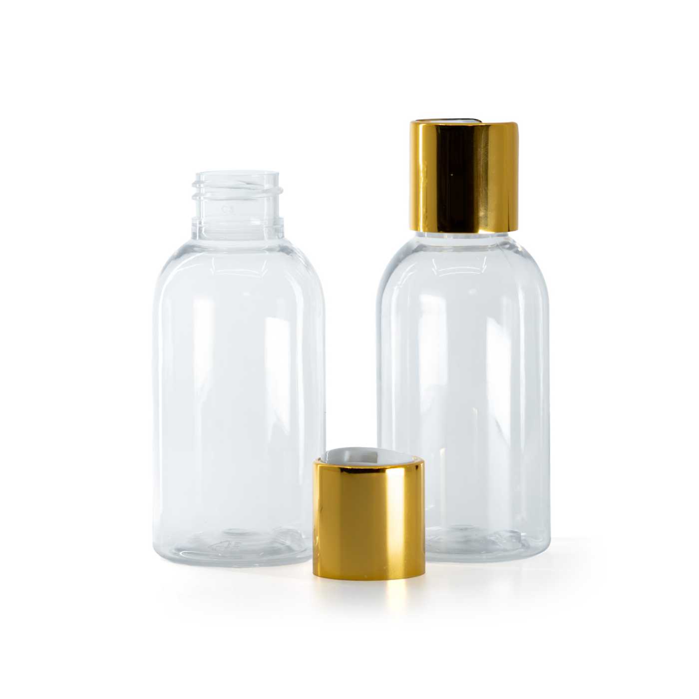 Plastová fľaša priehľadná okrúhla, disc top vrchnák, zlatý, biely stred, 100 ml