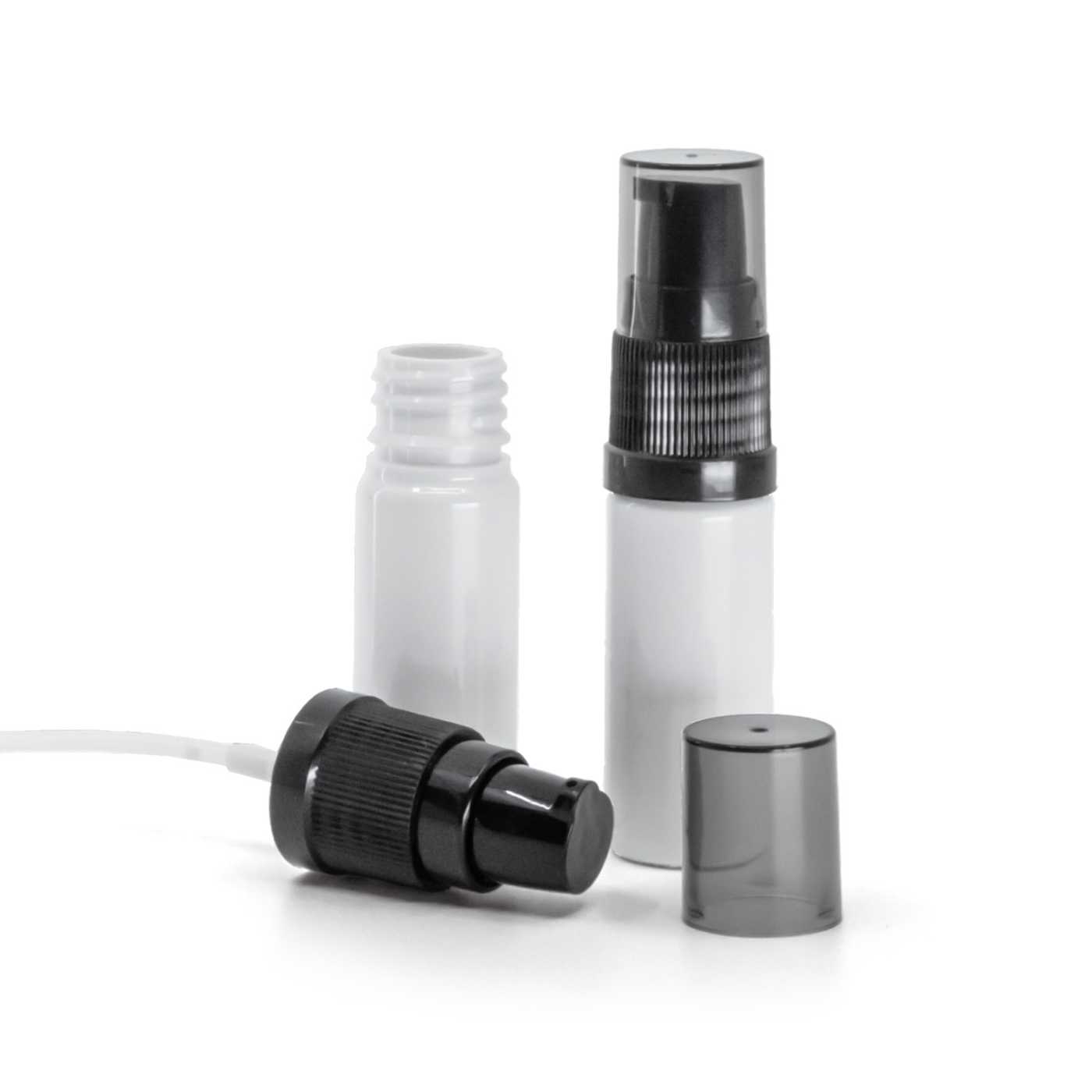 Čierny plastový dávkovač krémov s čiernym nepriehľadným uzáverom. Je vhodný na všetky naše sklenené liekovky.