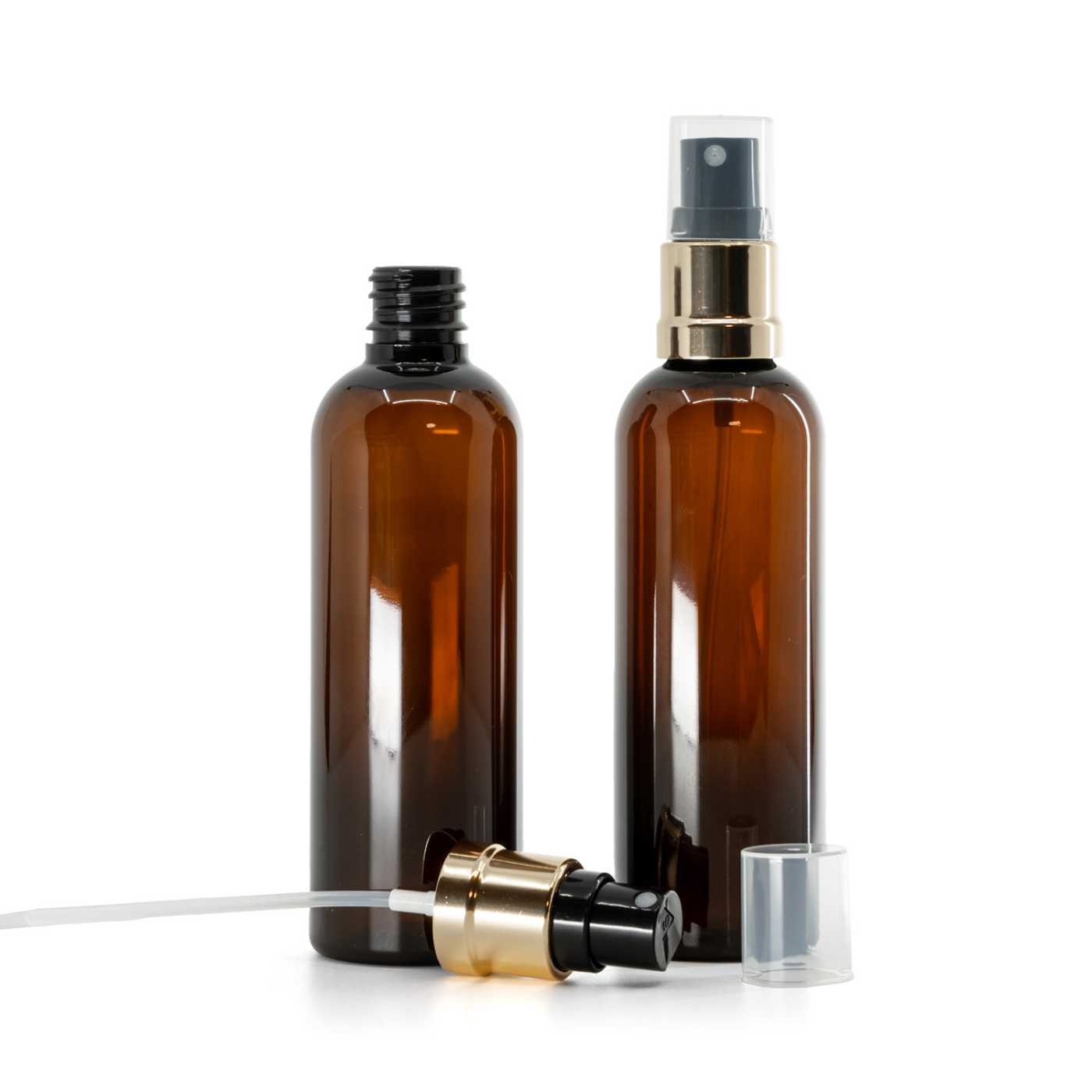 Plastová fľaška, liekovka, hnedá, čierno-zlatý rozprašovač, 100 ml