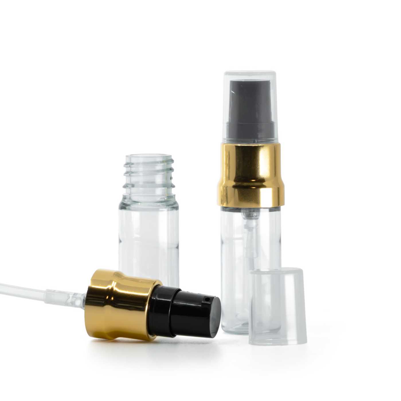 Plastová fľaška, liekovka, priehľadná, čierno-zlatý lesklý dákovač, priehľadný vrch, 10 ml