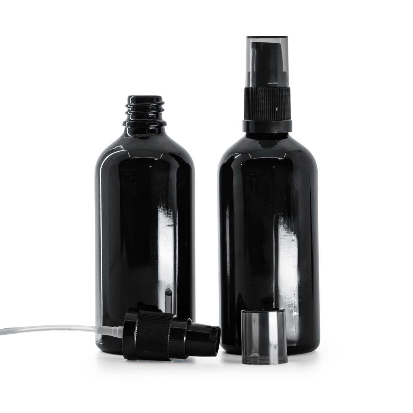 Čierny plastový dávkovač krémov s čiernym nepriehľadným uzáverom. Je vhodný na všetky naše sklenené liekovky.