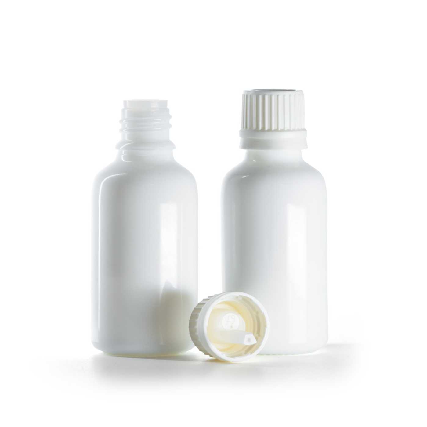 Sklenená fľaška, liekovka, biela, biely vrchnák s kvapátkom, 30 ml