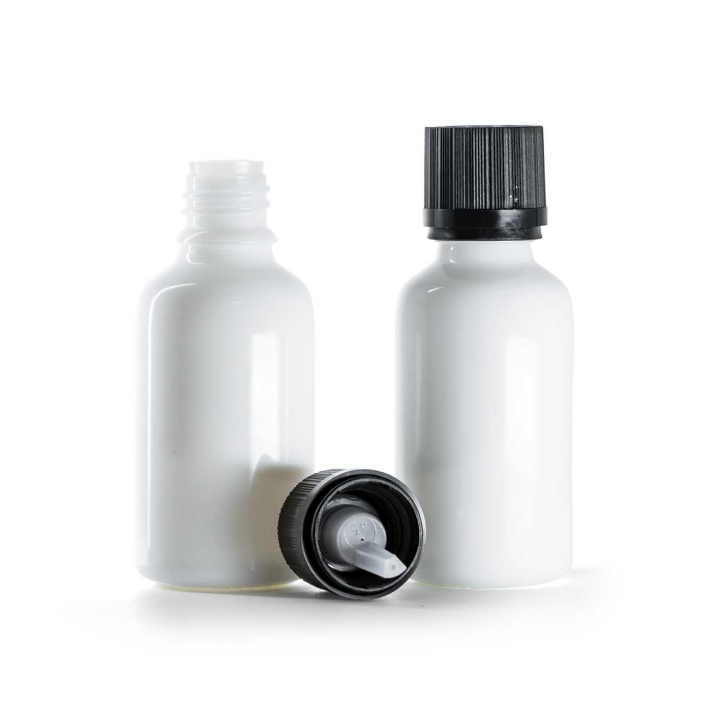 Sklenená fľaška, liekovka, biela, čierny vrúbkovaný vrchnák s poistkou, 30 ml
