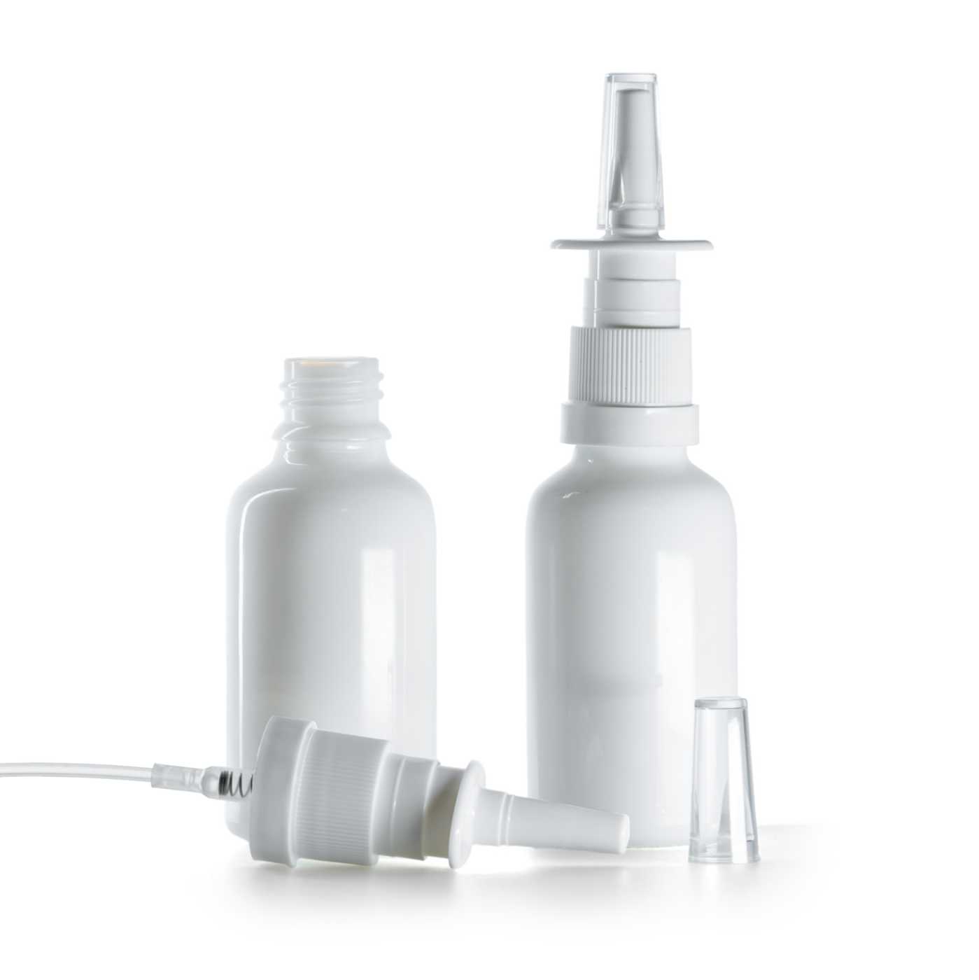 Sklenená fľaška, liekovka, biela, sprej do nosa 30 ml