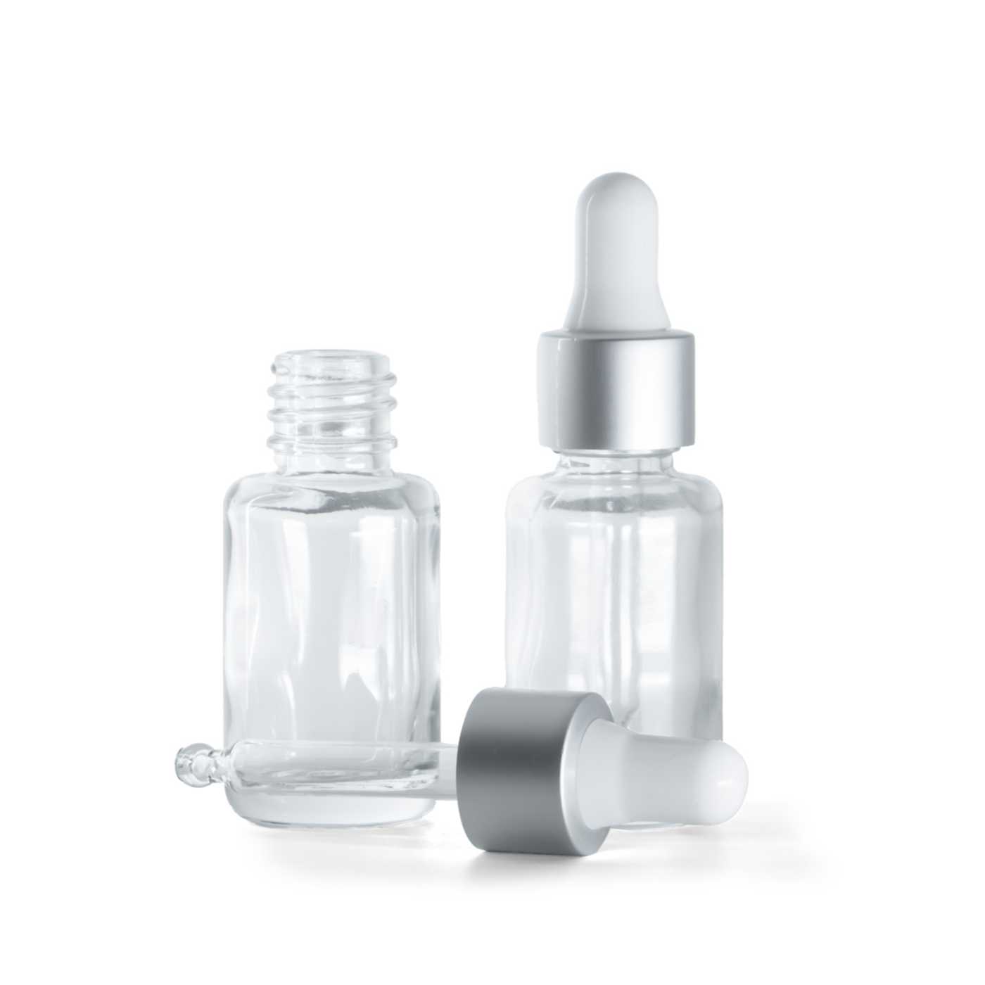 Sklenené kvapátko v kombinácii biela / strieborný mat, vhodné na fľašku s priemerom hrdla 18 mm a objemom 15 ml.Dĺžka sklenenej tuby: 56 mmMateriál: sklo, silikón, hliník, plast