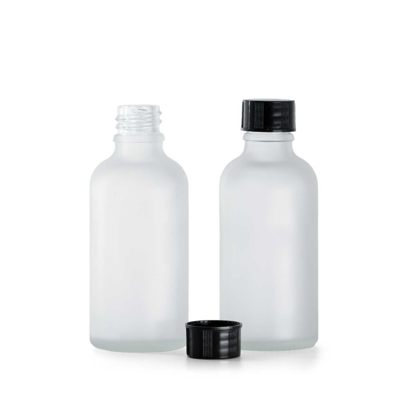 Sklenená fľaška, priehľadná mliečna, vrchnák čierny, 50 ml