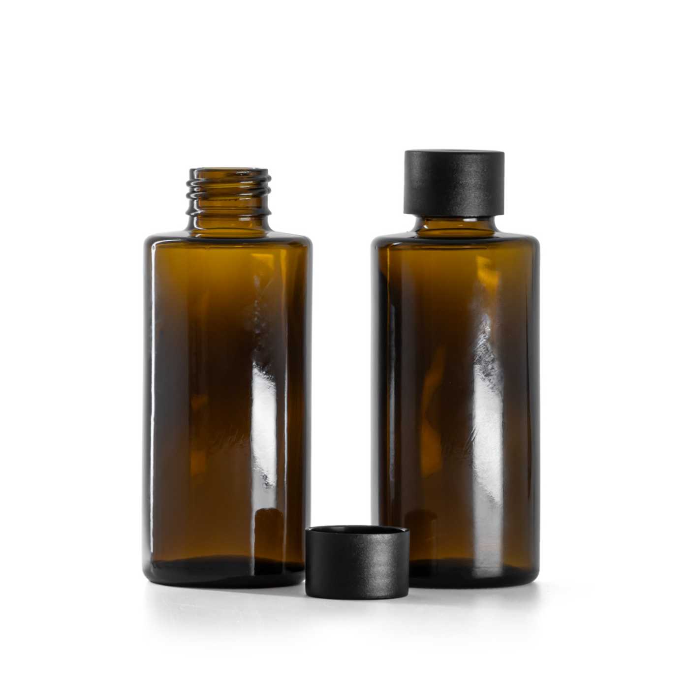 Sklenená fľaška, rovný vrch, 24 mm, matný čierny vrchnák, 100 ml